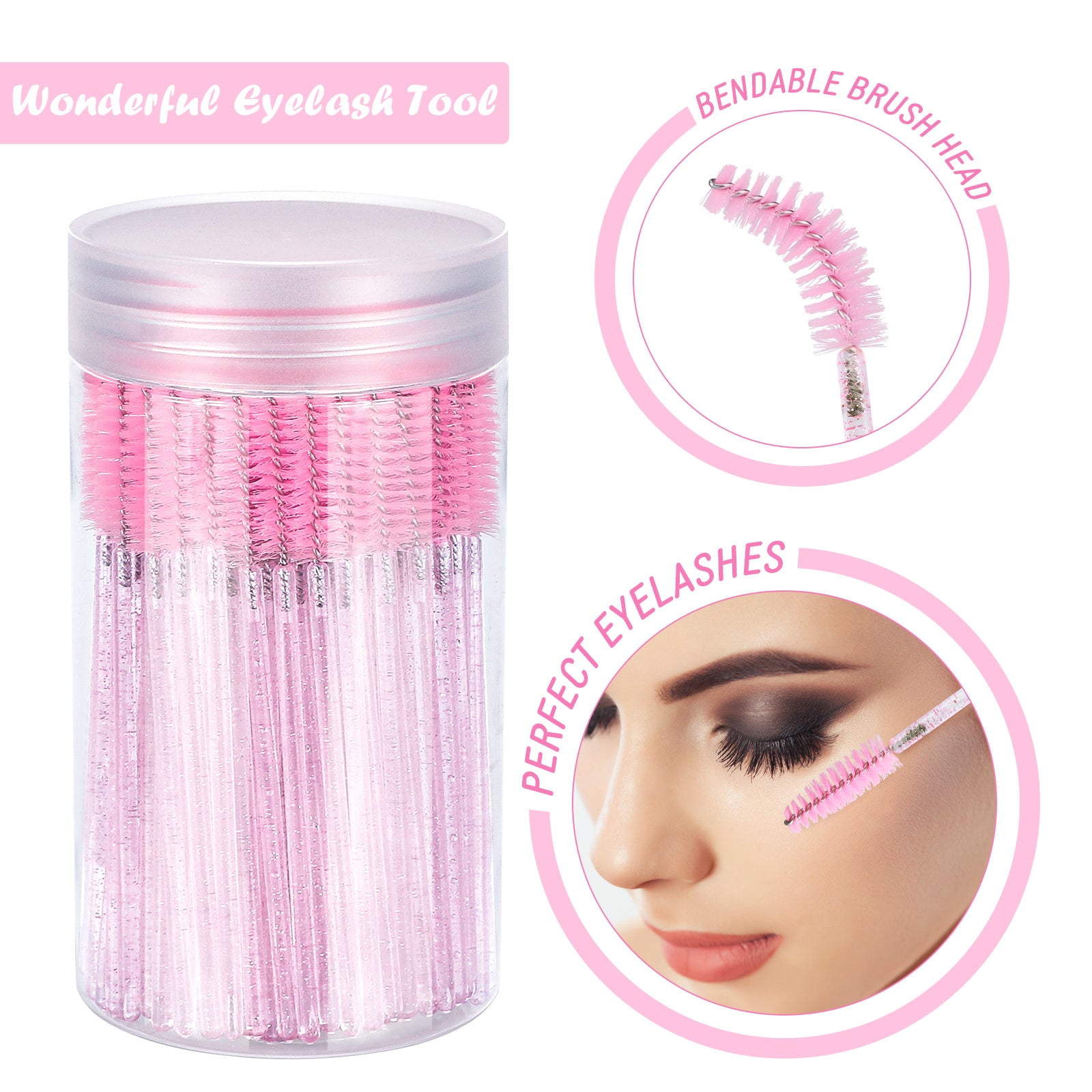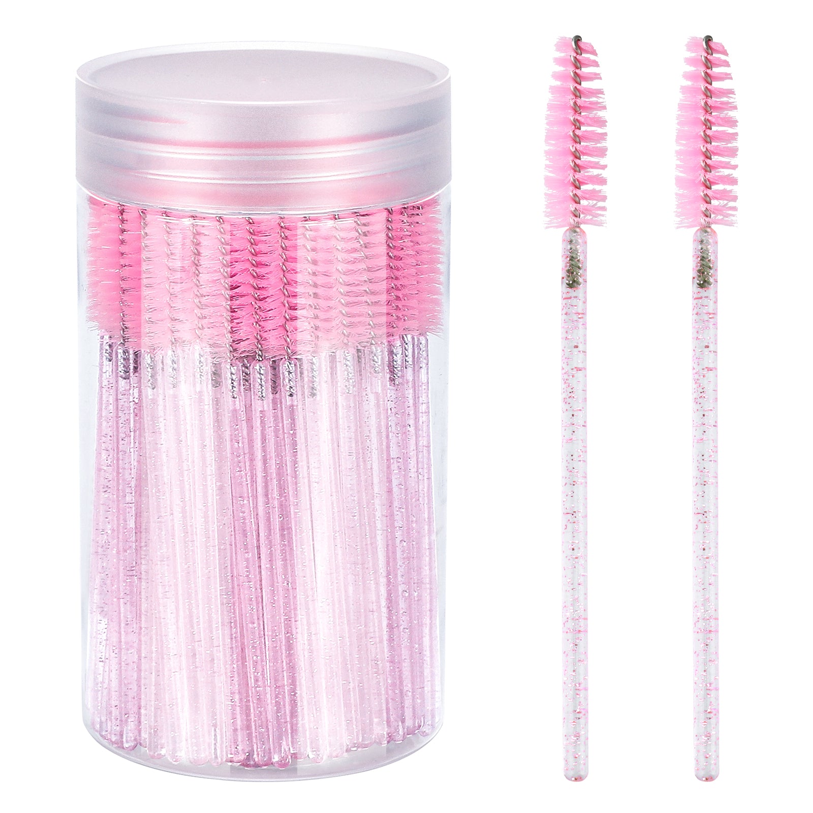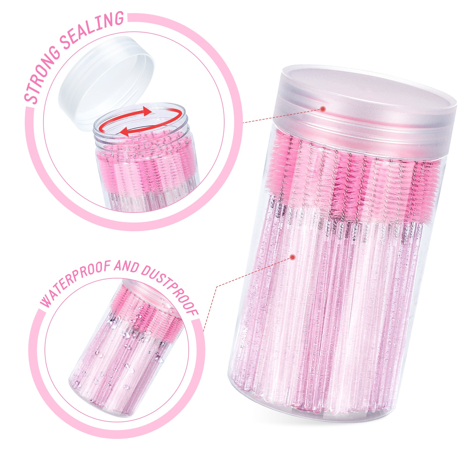 G2PLUS 100PCS Crystal Mascara Wands, Pink Disposable Eyelash Eyebrow Spoolie Brush, Eyelash Brush for Makeup, Eyelash Extensions and Eyebrow Brush with Container