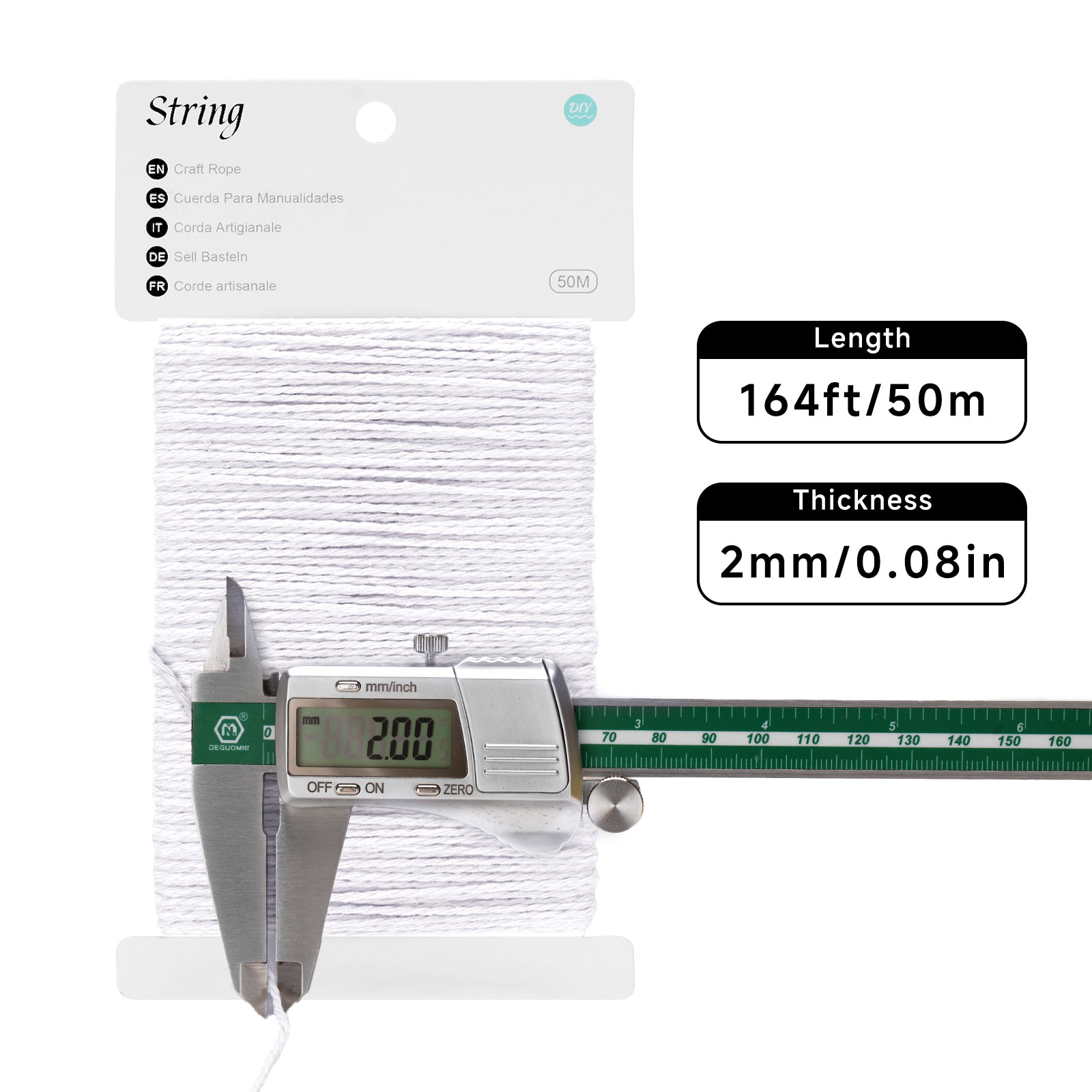 - 【Cotton Twine Set】This 2mm white cotton twine comes in a 164ft length, neatly packed on a sturdy paper card for easy storage and dispensing. Perfect size for daily wrapping, crafting, and household use.