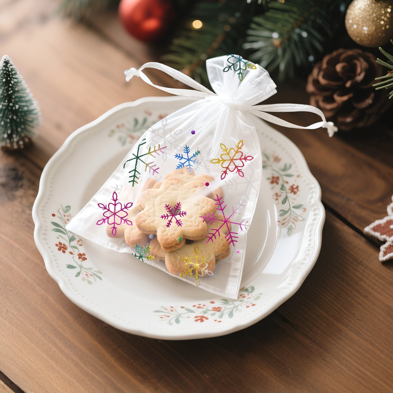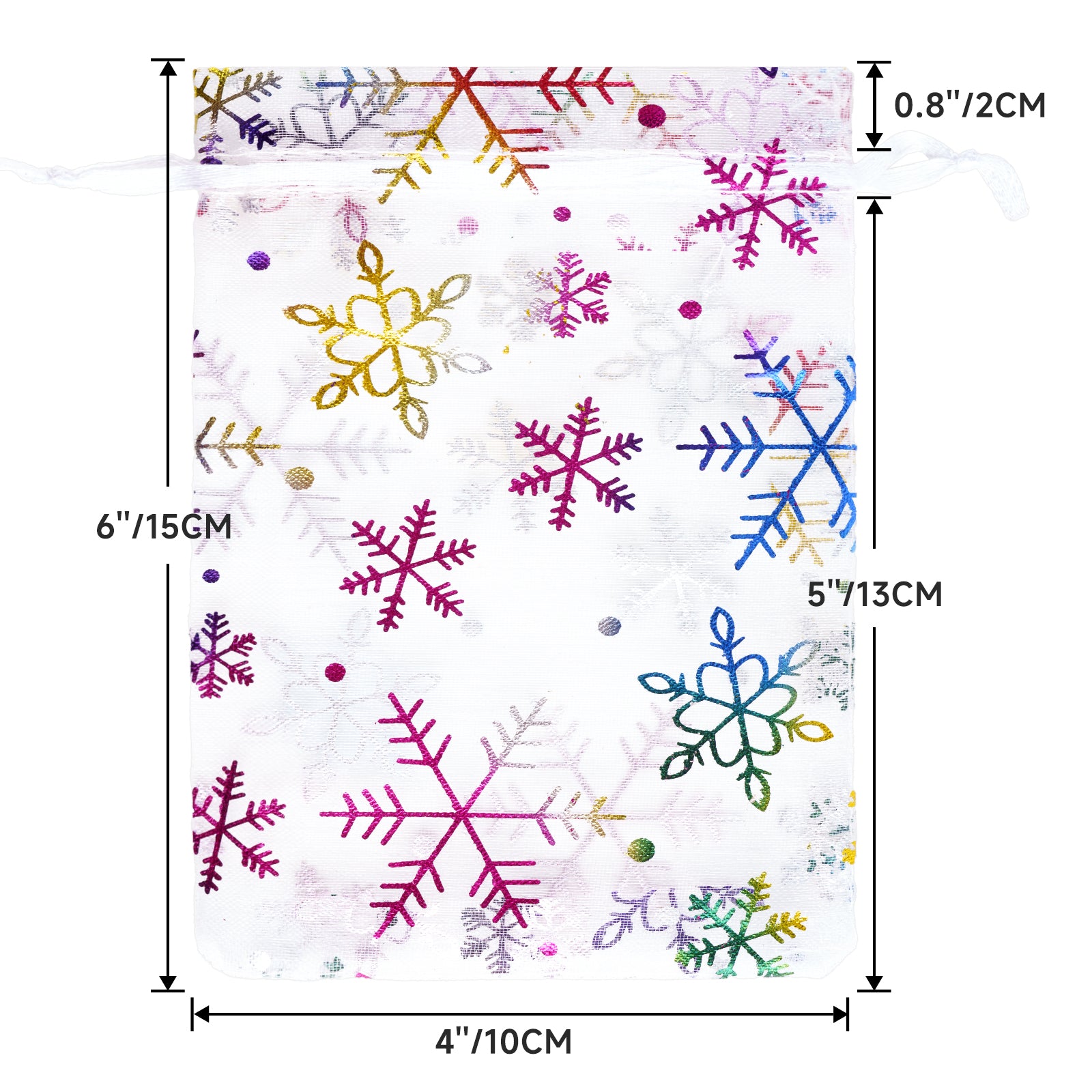 - 【Colored Snowflake Organza Bags】:White organza bags with colored snowflake patterns, snowflake organza gift bags are full of winter wonderland atmosphere. Snowflake organza bags are perfect for winter wonderland baby showers, birthdays, weddings, Christmas, New Year, and Advent calendar gifts. Add a touch to your party favors.