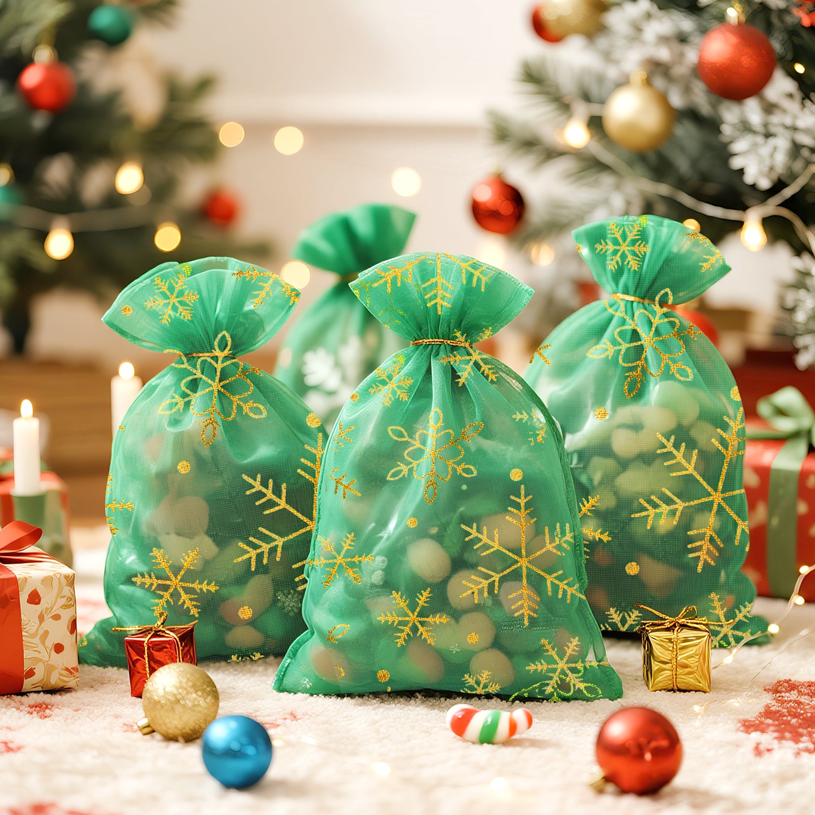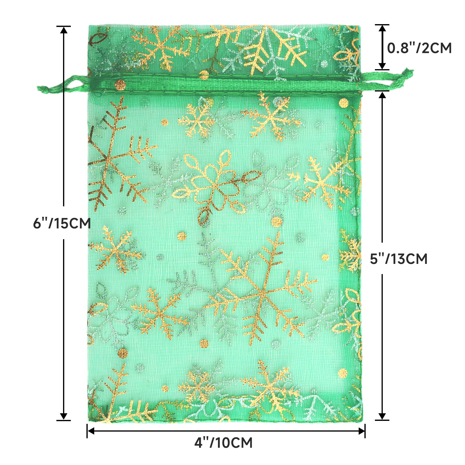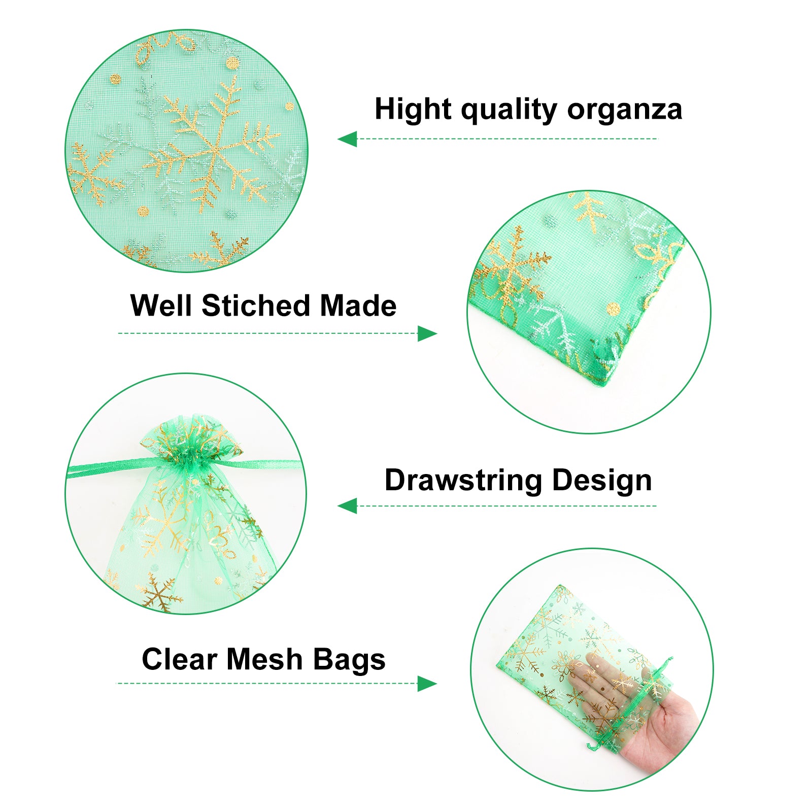 - 【Green Snowflake Organza Bags】:Green organza bags with gold snowflake patterns, snowflake organza gift bags are full of winter wonderland atmosphere. Snowflake organza bags are perfect for winter wonderland baby showers, birthdays, weddings, Christmas, New Year, and Advent calendar gifts. Add a touch to your party favors.