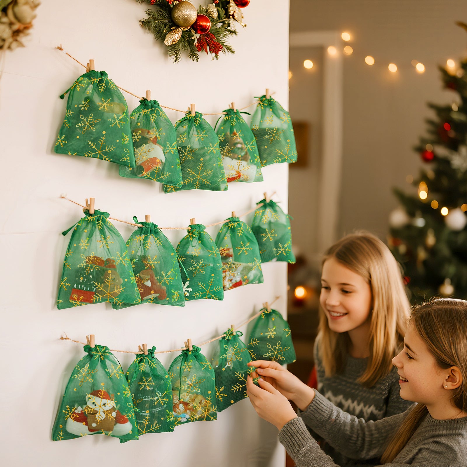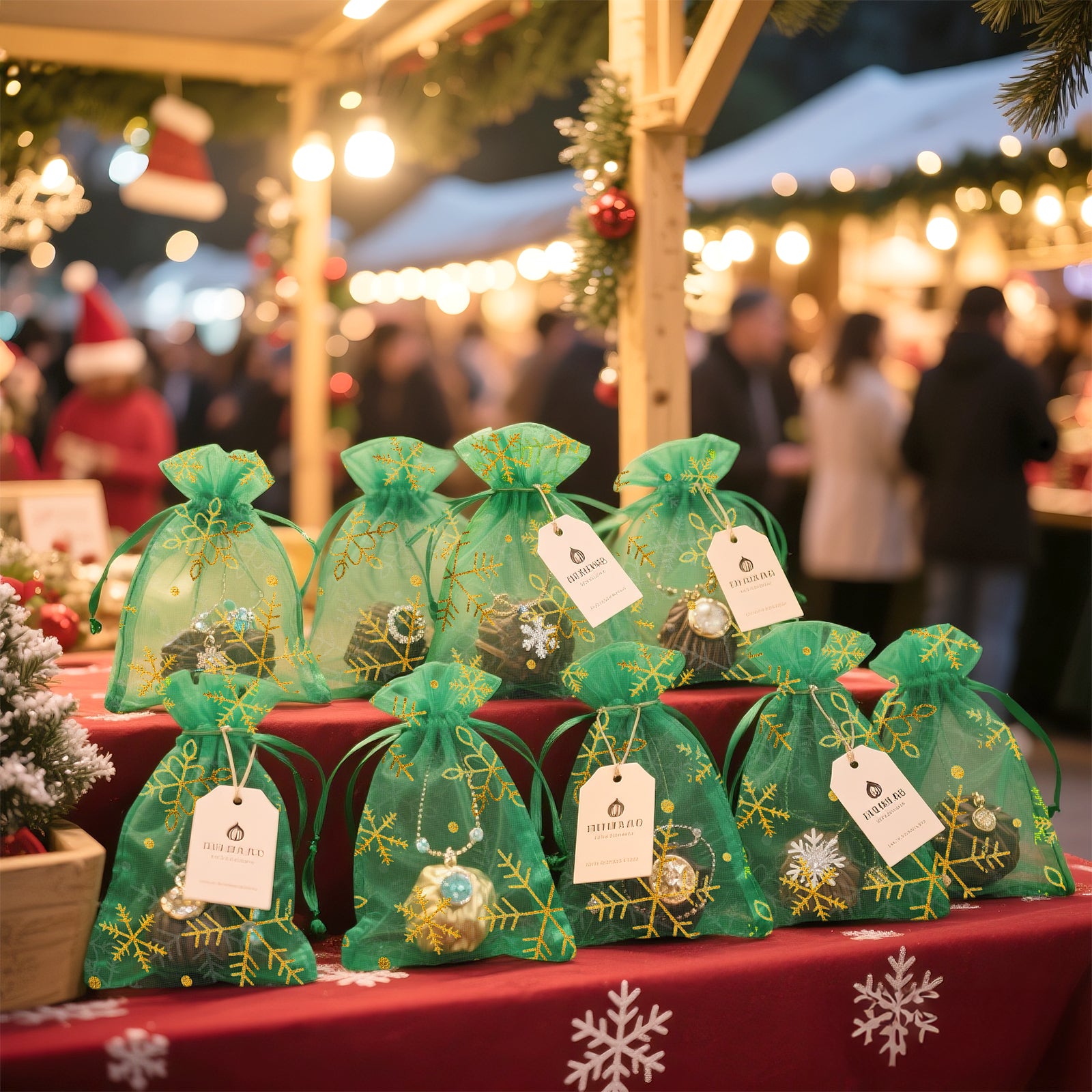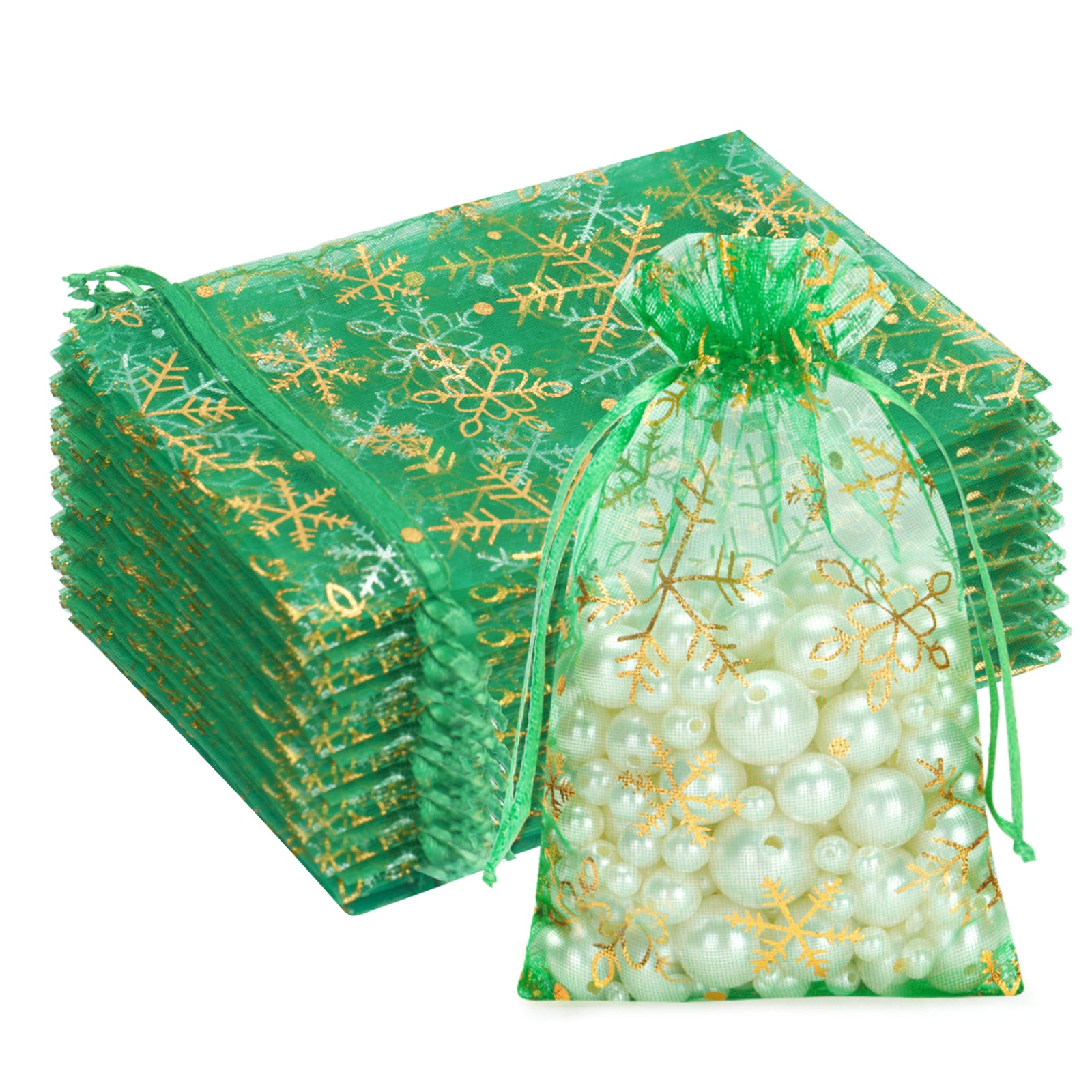- 【Green Snowflake Organza Bags】:Green organza bags with gold snowflake patterns, snowflake organza gift bags are full of winter wonderland atmosphere. Snowflake organza bags are perfect for winter wonderland baby showers, birthdays, weddings, Christmas, New Year, and Advent calendar gifts. Add a touch to your party favors.