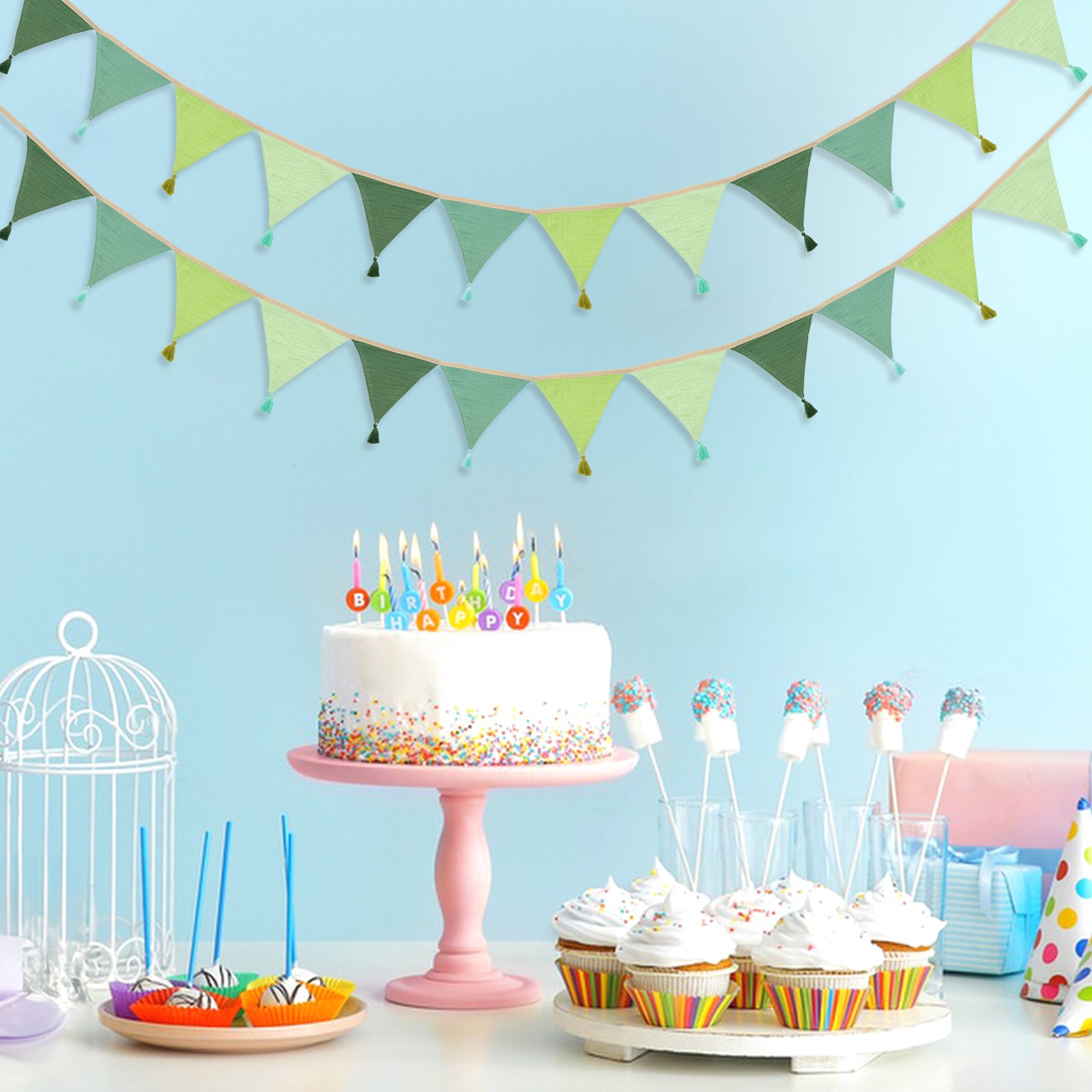 - Versatile Fabric Banners: Our cotton triangular banners are perfect decorations for various parties, such as weddings, birthday parties, Easter, fall parties, baby showers, garden decor, and any celebration. They can be used for room decoration, birthday decoration, baby shower decoration, bedroom decoration, etc. Hang these flag banners on your child's bed, in classroom decorations or in camping-themed game room windows. Add them to your kid's bed, use them as backdrops for birthday photos in nurseries, for church nursery decorations, and more.