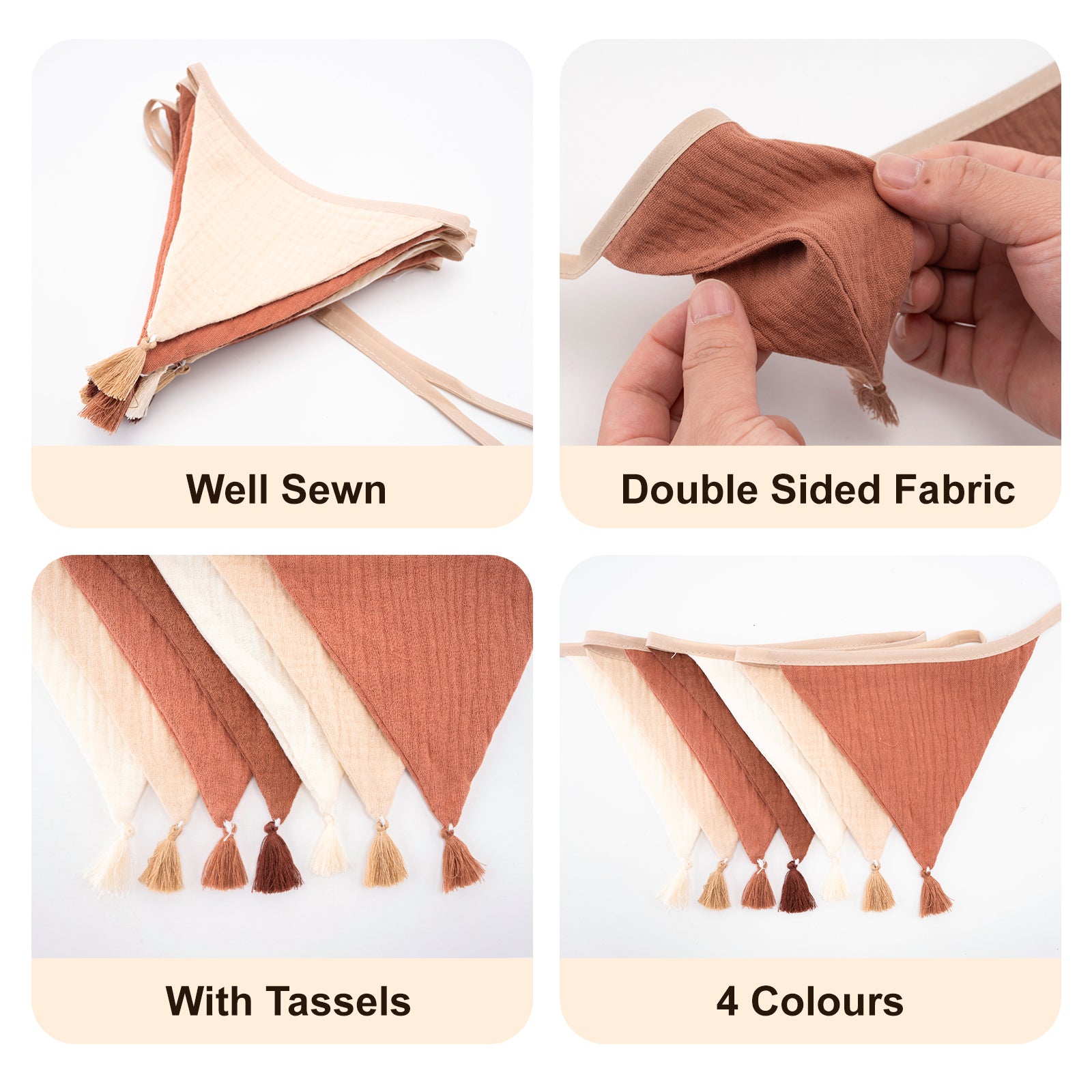 G2PLUS Cotton Fabric Bunting Banner, 9Ft Khaki Triangle Pennant Banner Flag, 12pcs Double-Sided Bunting Garland with Tassels for Birthday Party, Wedding, Holiday, Classroom Hanging Decor