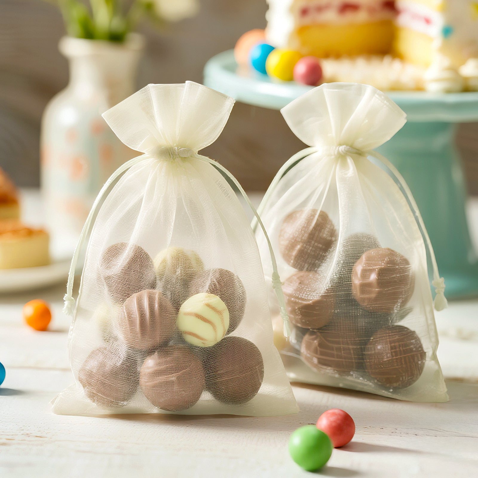- 【Holiday Organza Bags】:Solid ivory organza bags are perfect for holiday party favors, such as Halloween, Thanksgiving, Christmas, New Year, Easter, Valentine's, and other holiday. Sheer organza bags for candy, snacks, goodies, and small festival toys. Tulle bags are suitable for trick or treat candy bags, little gift bags.