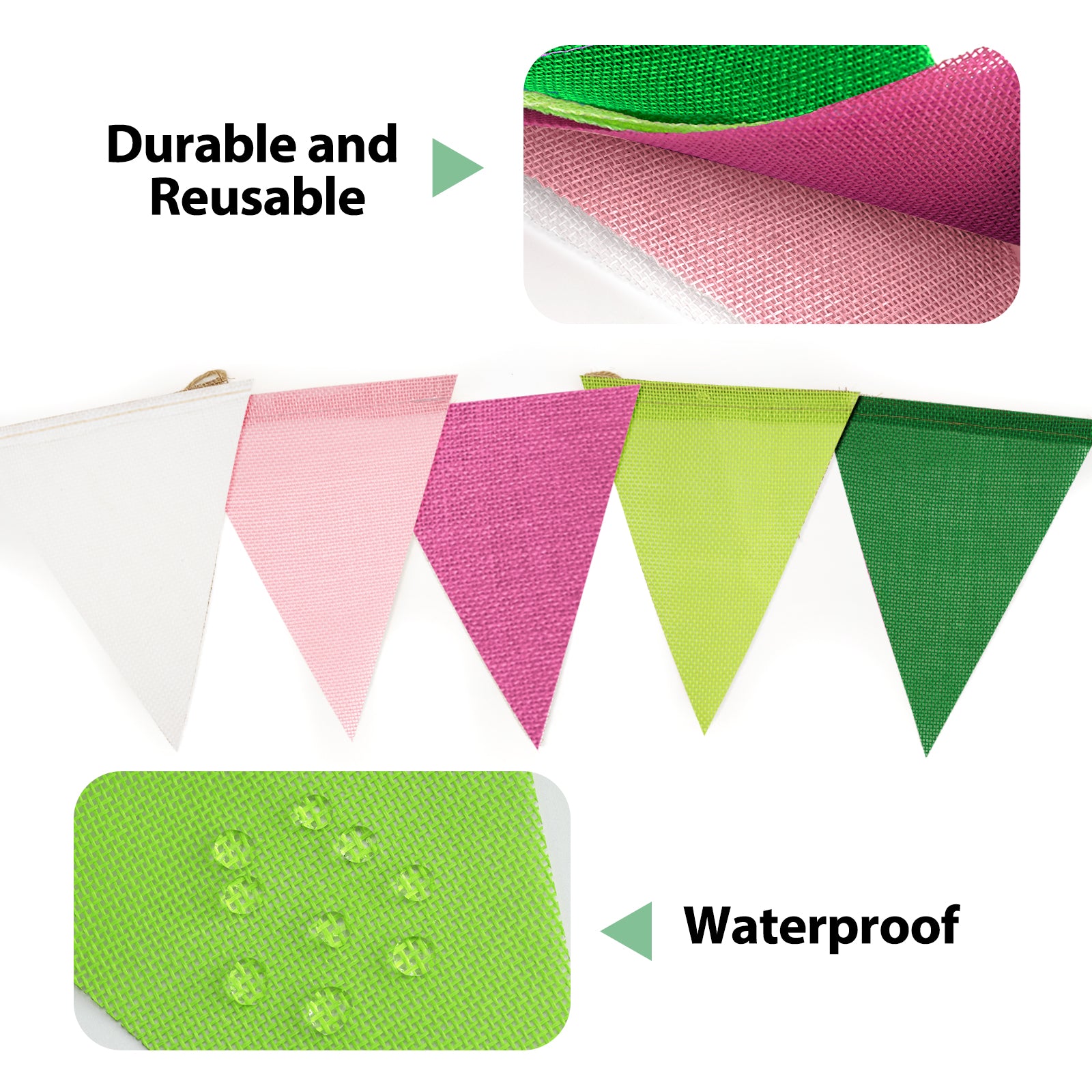 G2PLUS Pre-Strung Burlap Pennant Banner, 65Ft Pink Green and White Triangle Flag Bunting, 60pcs Pennant Banner Bunting Garland for Birthday, Wedding, Camping, Rustic Boho Theme Party Decorations