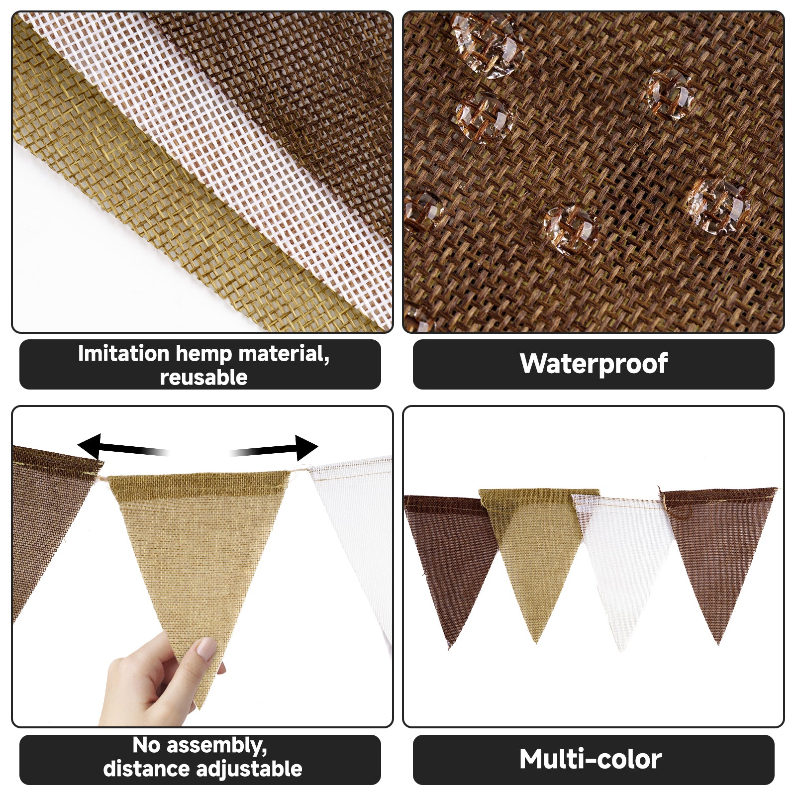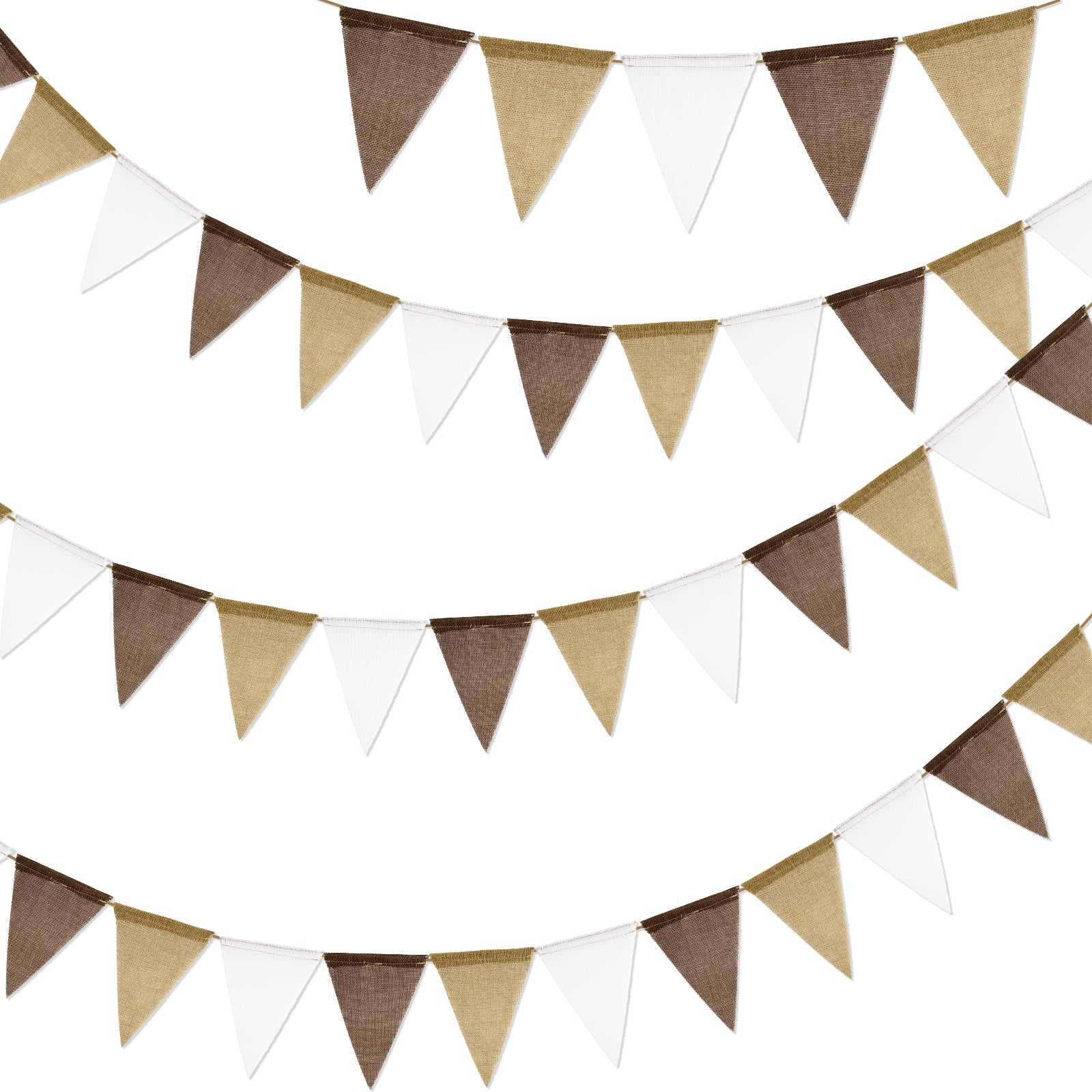 Rustic Banner Garland: Featuring a gradient mix of brown, khaki, and white tones, this triangle bunting banner creates a natural and rustic look, perfect for farmhouse or outdoor settings. The faux burlap fabric gives a soft texture without shedding or fraying.Perfect for fall-themed parties, harvest celebrations or rustic events, these pre-strung bunting flags can easily set a festive mood
