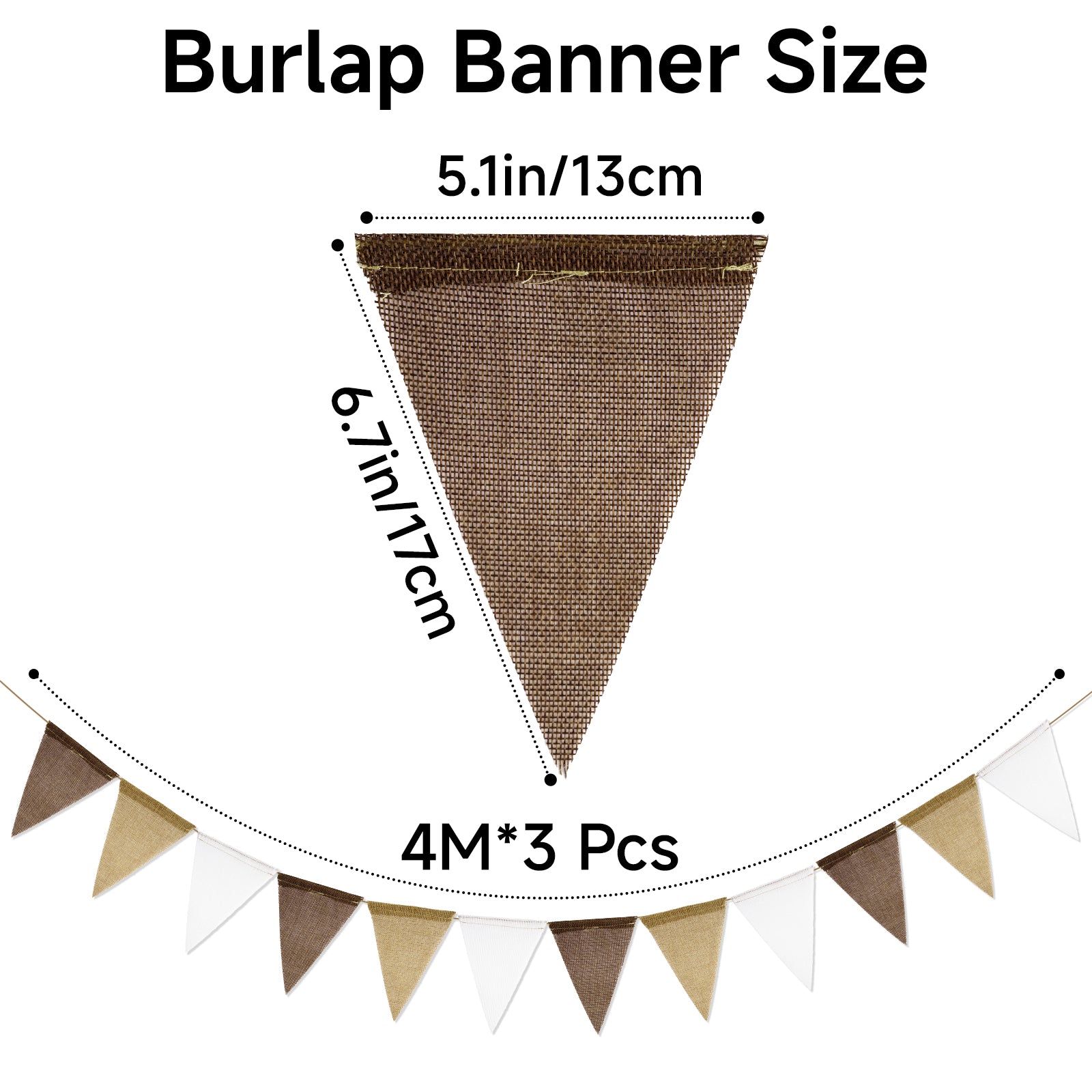 Burlap Bunting Size: Comes with 3 package banners with 36 pcs pennant flags. Each burlap banner garland is 9.8ft/3m long, 30 feet in total. Every triangular flag size: 6.7×5.1inch. And the distance between the burlap banner can be adjusted as needed. The flexible design works for both indoor events and outdoor parties