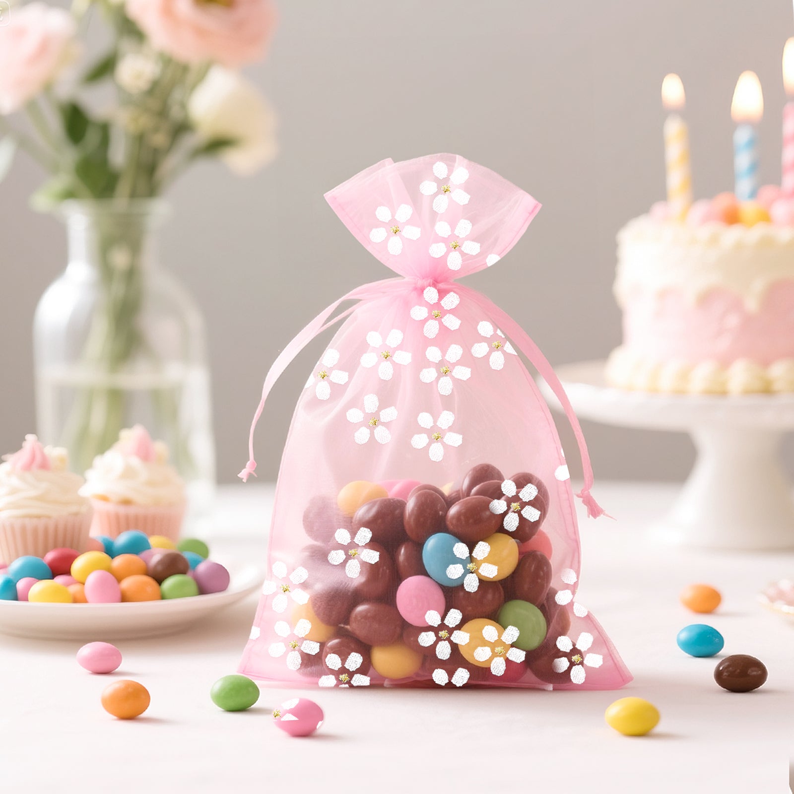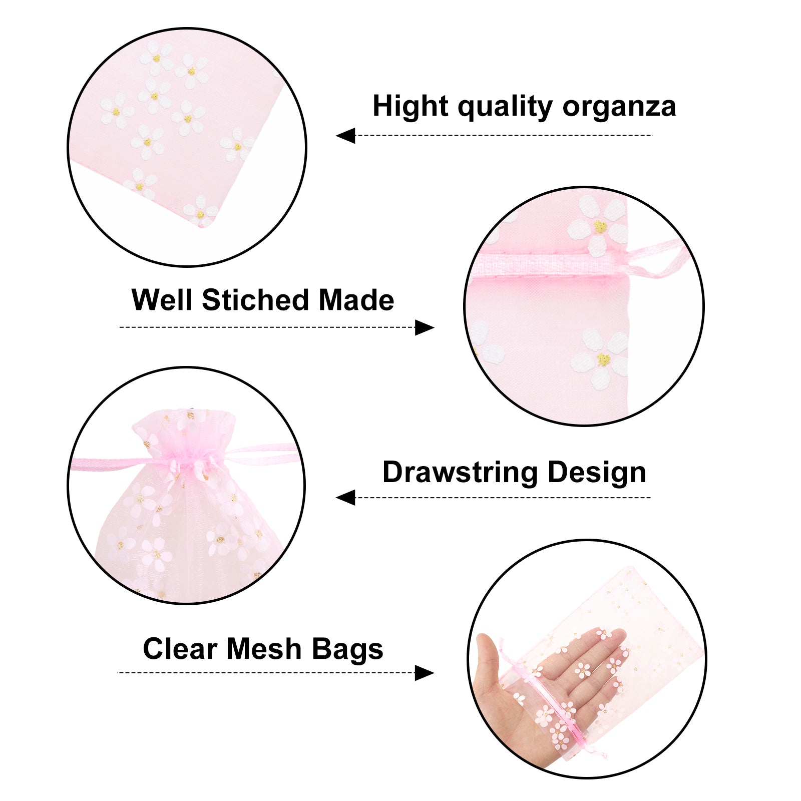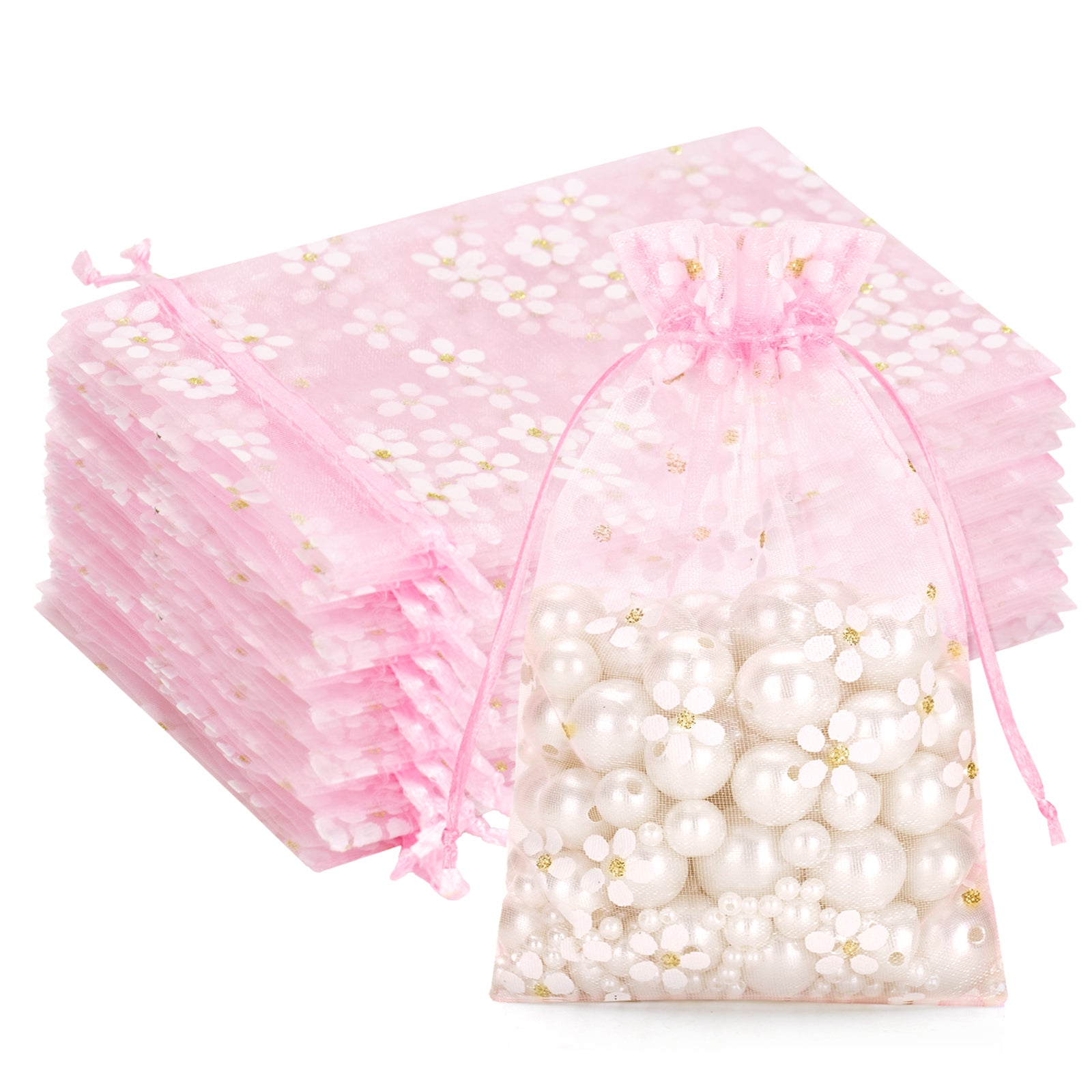 - [Daisy Organza Bags] - Sheer mesh bags feature a pink color with a delicate daisy print, creating a romantic and elegant feel, making your gift wrap look even better. Sheer mesh gift pouches can be used to store candy, jewelry, soap, dried flowers, watches, earrings, rings, bracelets, pendants, scented beads, candles, cosmetic samples and other small items.