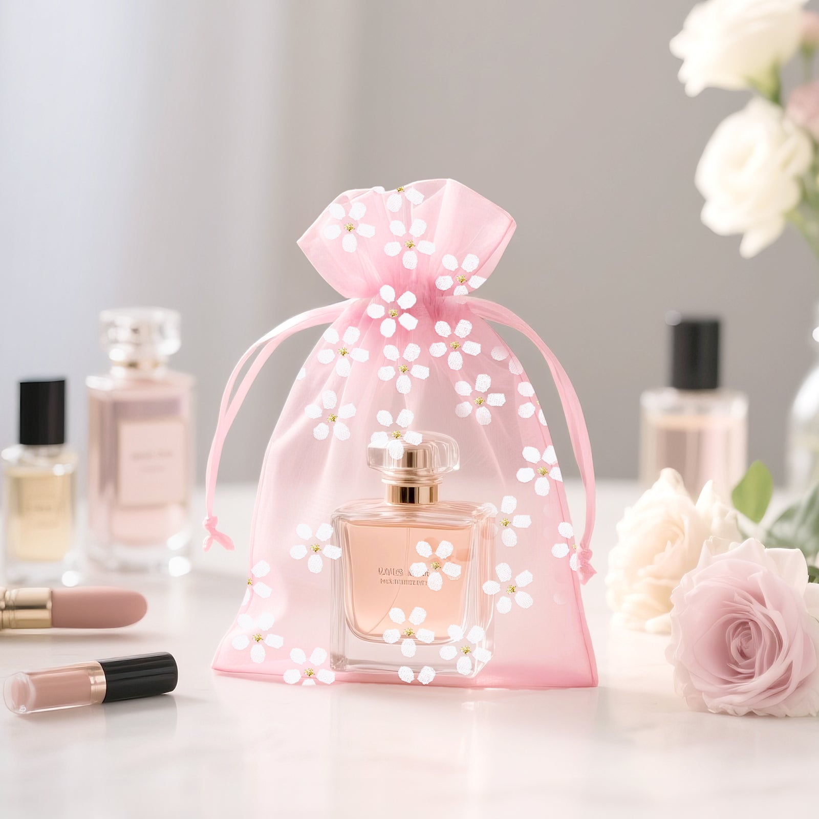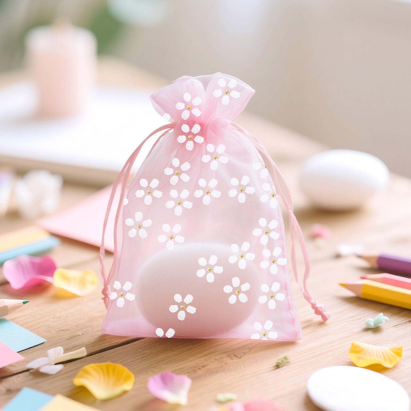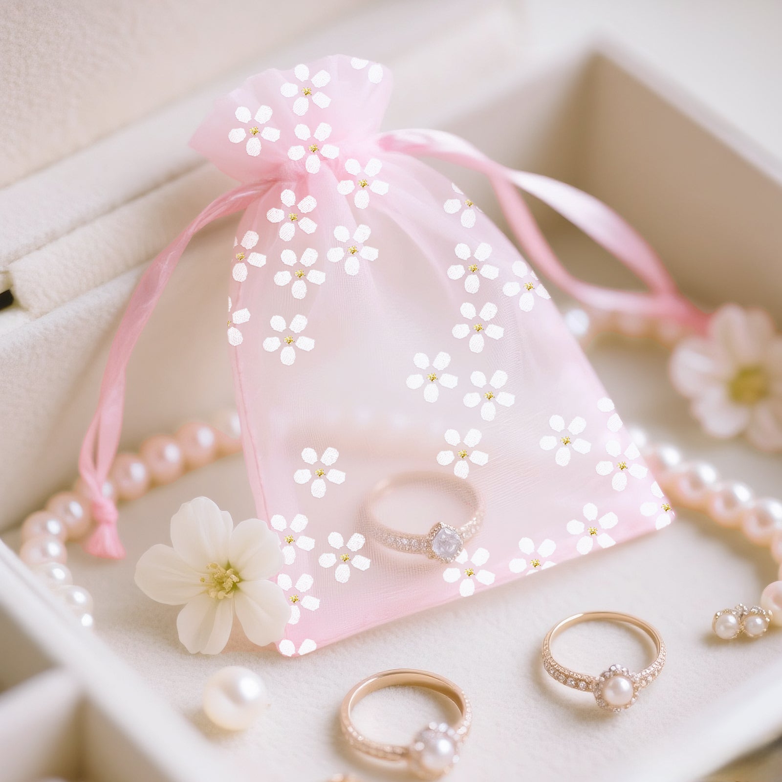 - [Daisy Organza Bags] - Sheer mesh bags feature a pink color with a delicate daisy print, creating a romantic and elegant feel, making your gift wrap look even better. Sheer mesh gift pouches can be used to store candy, jewelry, soap, dried flowers, watches, earrings, rings, bracelets, pendants, scented beads, candles, cosmetic samples and other small items.