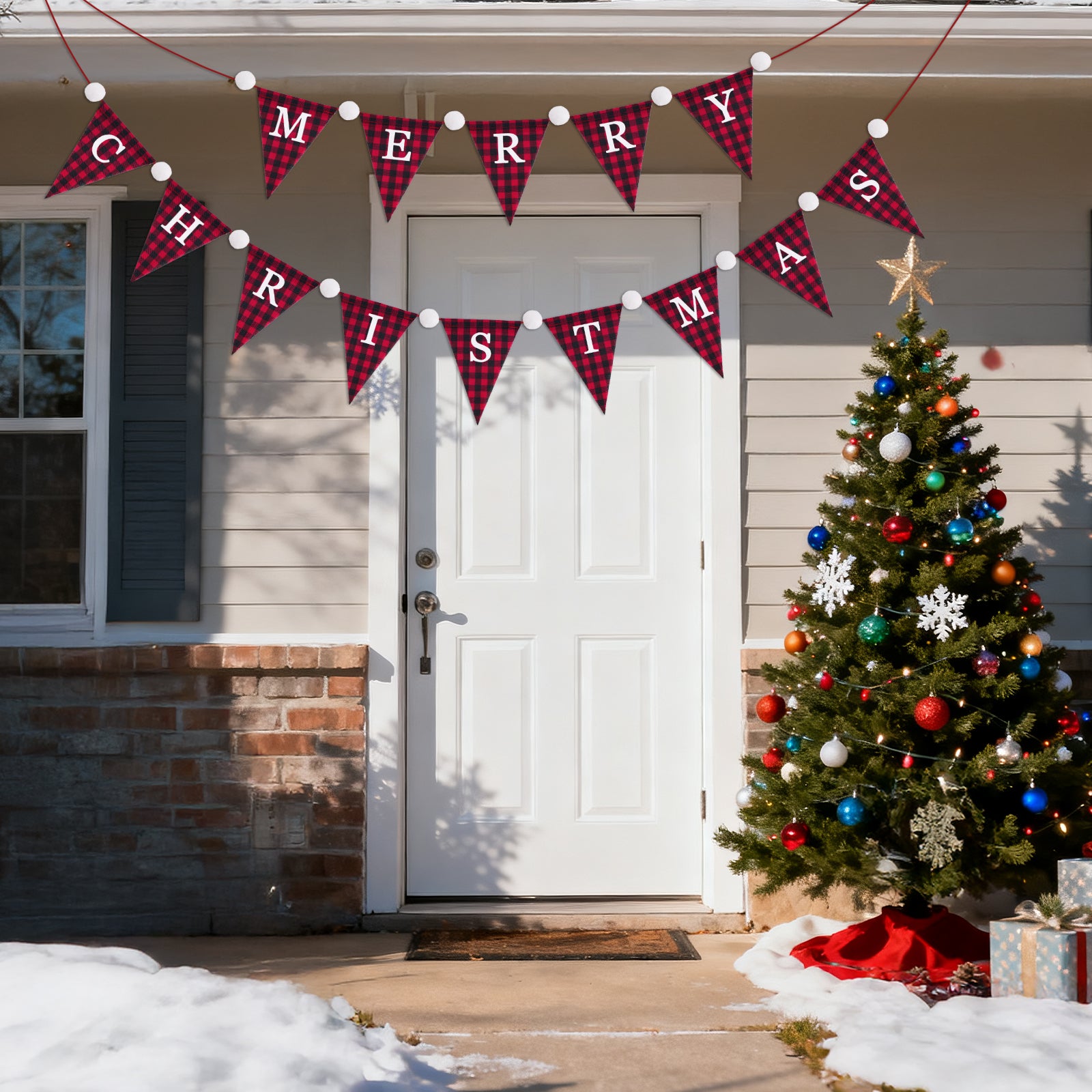 - Merry Christmas Party Banner: The front of the banner features a distinctive red and black grid pattern combination with MERRY CHRISTMA words.The classic red and black plaid pattern creates a warm festive look, while the soft white pom pom trim brings a playful, elegant touch. Perfect for creating a cozy Christmas atmosphere.